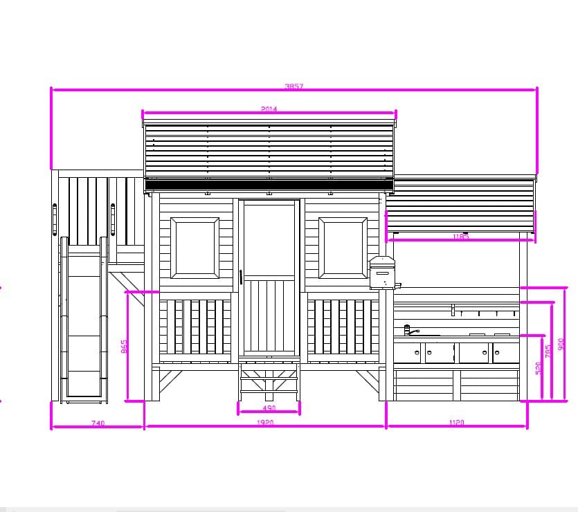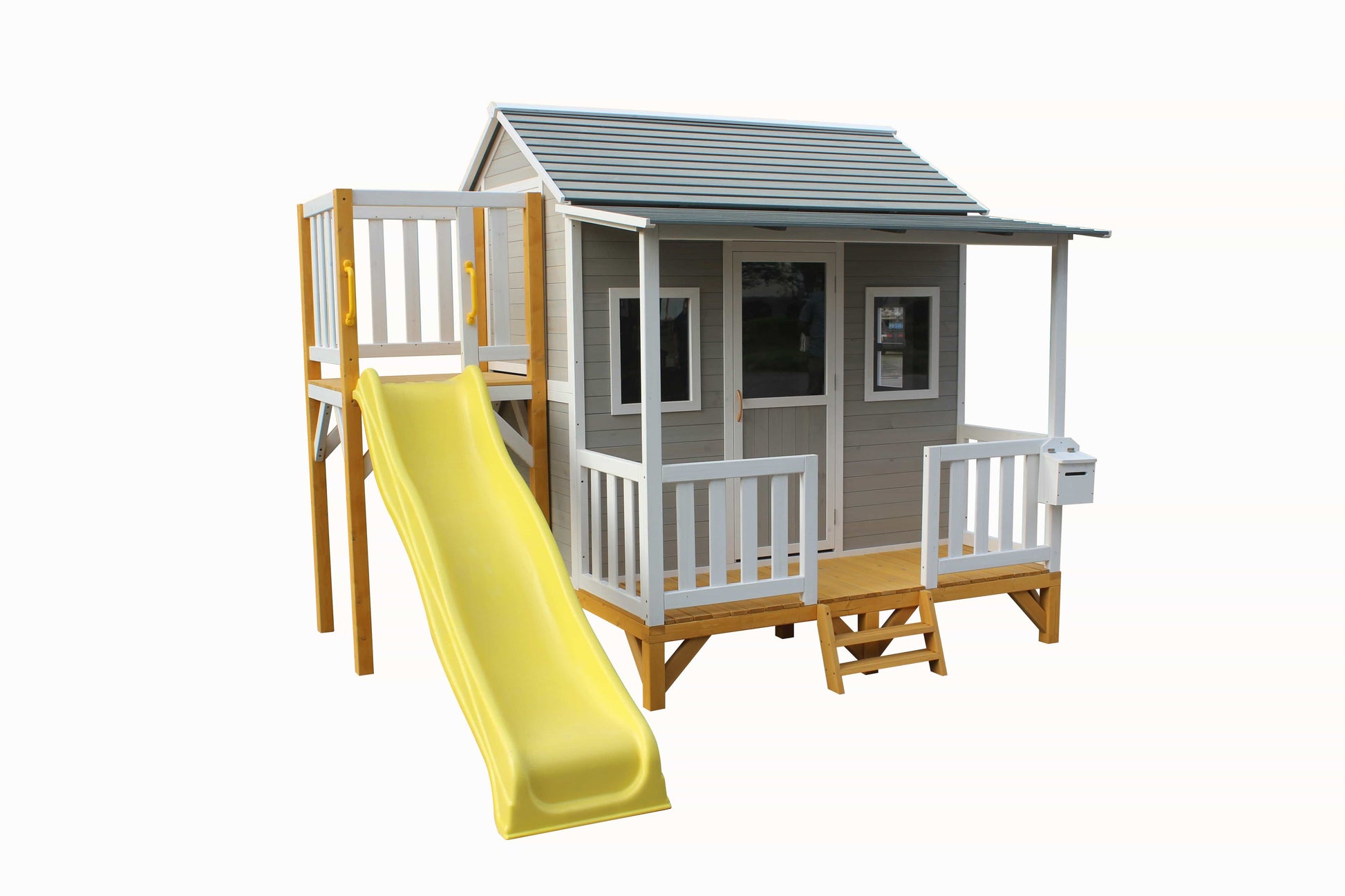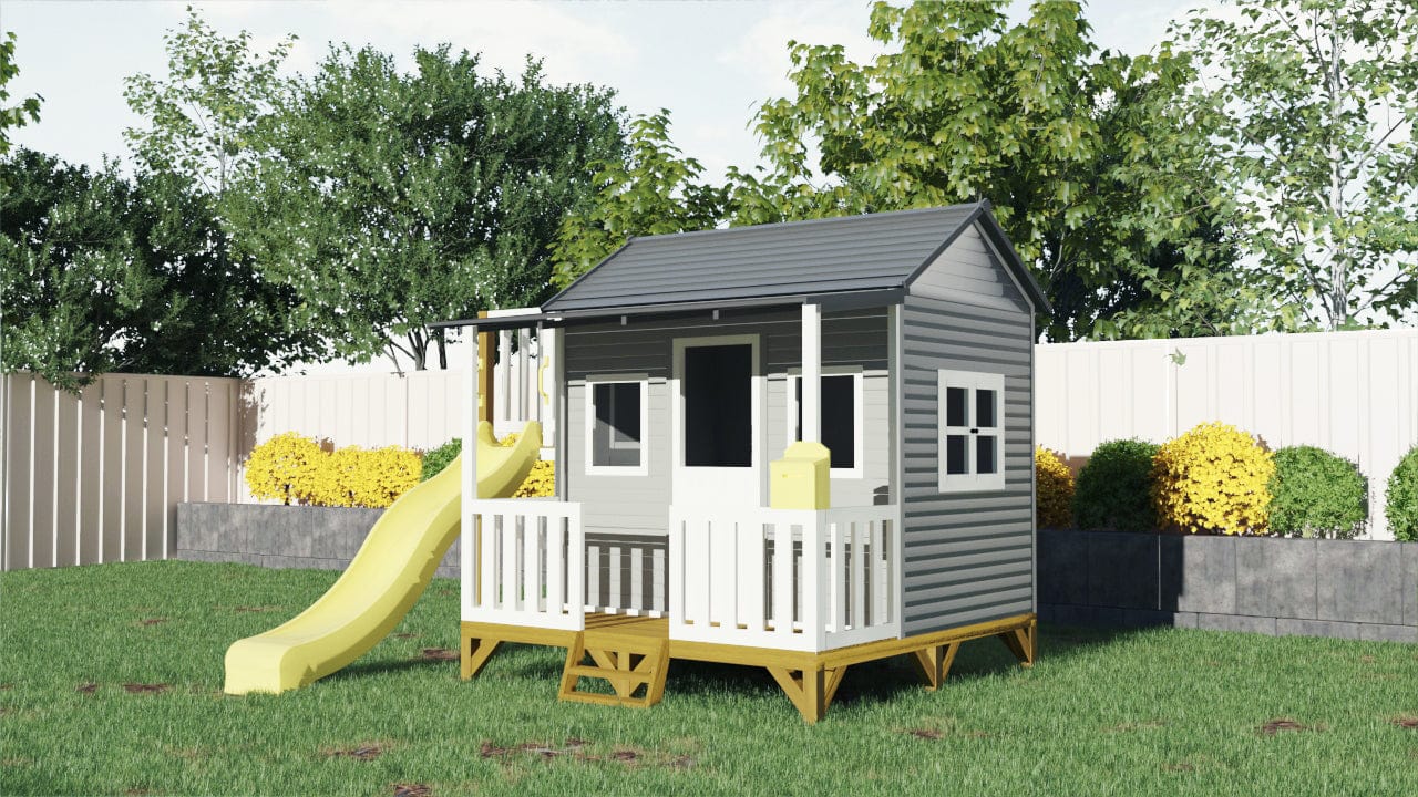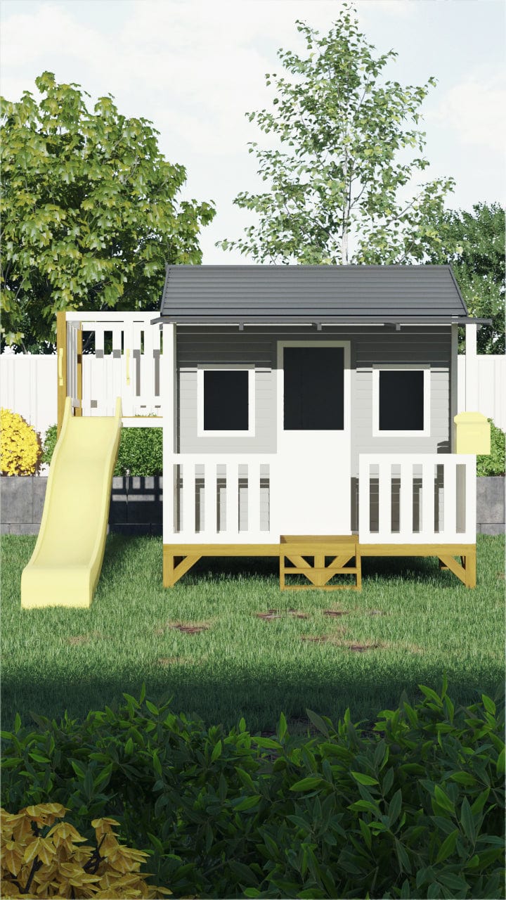Our cubbies are painted with a temporary water-based stain. Please note: stained water based colours may differ or change. We recommend painting your cubby house with two coats of primer and two coats of a durable outdoor paint from Taubmans for longevity, within 4 weeks of outdoor use. The Delightful Shack come sin Grey/White and Wood Look Colour as pictured.